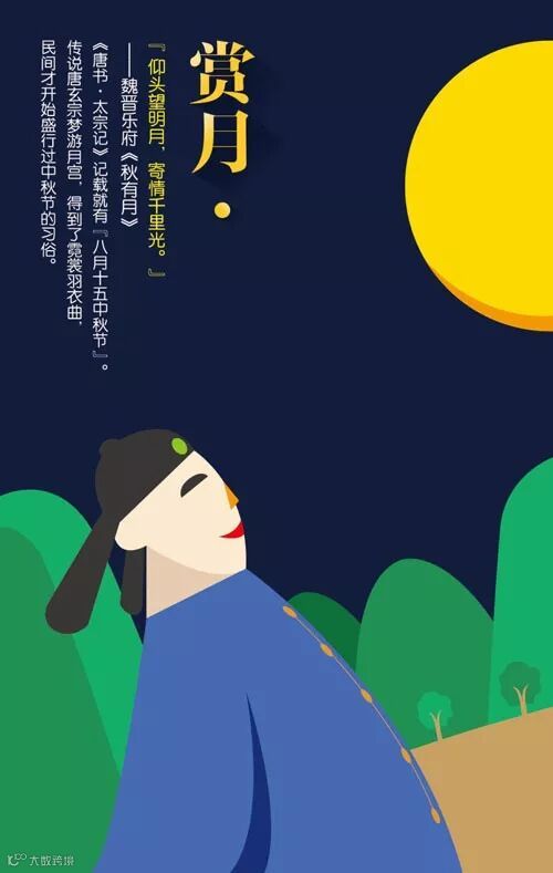 在中秋节,我国自古就有赏月的习俗,在唐代,中秋赏月、玩月颇为盛行。每逢这一日,京城的所有店家、酒楼都要重新装饰门面, 牌楼上扎绸挂彩,出售新鲜佳果和精制食品,夜市热闹非凡,百姓们多登上楼台,一些富户人家在自己的楼台亭阁上赏月,并摆上食品或安排家宴,团圆子女,共同赏月叙谈。