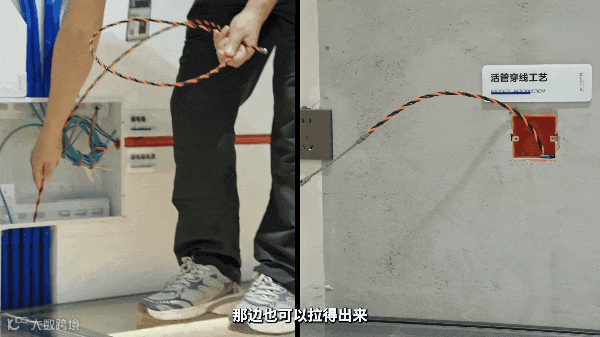 活线穿管工艺:先布管后穿线,施工把所有线管都预埋固定好,然后再穿线,保证所有线路都能灵活抽动,后续使用即使需要升级、更换线路,也不必凿墙换管。