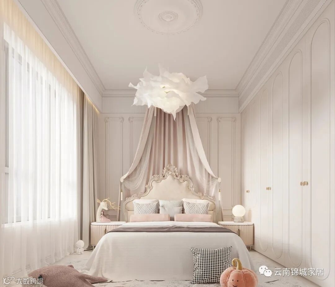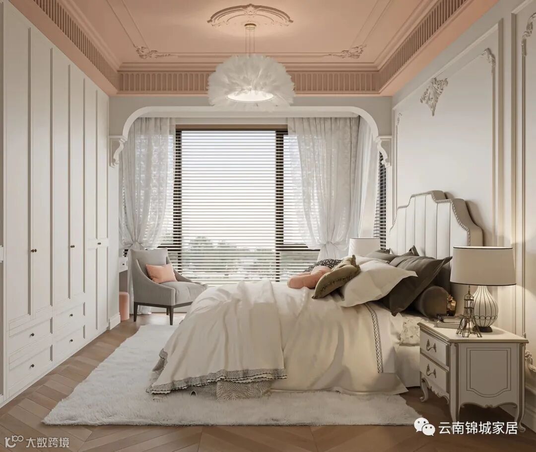 米白色墙面石膏雕花线条搭配同色精致优雅的到顶衣柜,地板铺设了柔软的毛绒地毯,增加了复古的质感,整个空间显得高贵而又不失温柔。加上梦幻的羽毛灯,气质优雅得像童话里的公主。