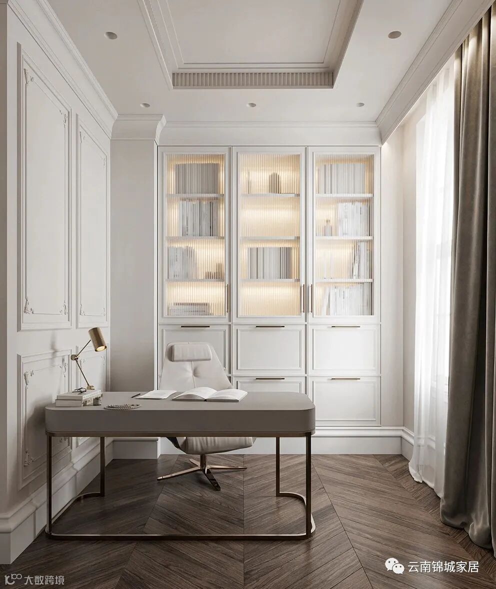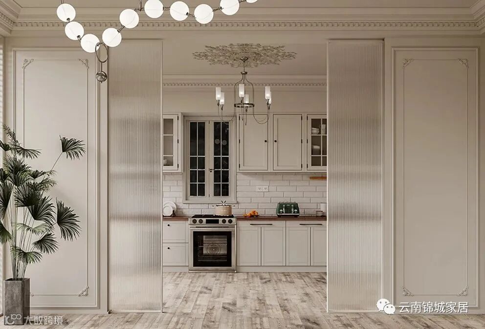 法式轻奢定制继承传统经典元素也褪去繁杂,整体空间以浅色为主色,用轻快的色彩搭配金属、玻璃等元素把古典美融入现代时尚中,将平凡的生活变成视觉盛宴。