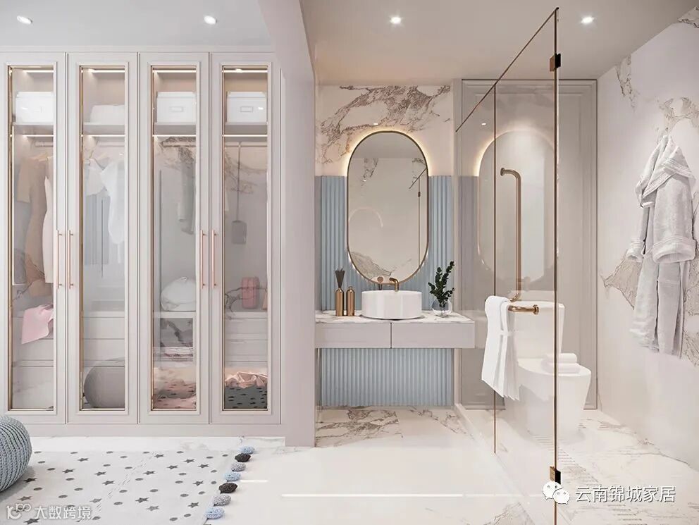 衣帽间采用低饱和的颜色进行搭配,温柔而优雅,衣柜采用玻璃门加灯带的设计,通透而充满高级感。