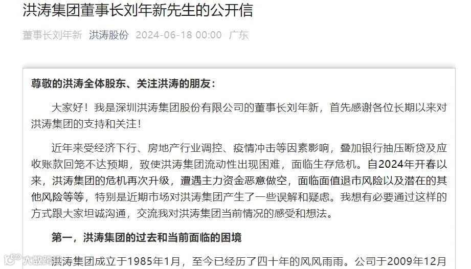 6月18日,深圳洪涛集团股份有限公司董事长刘年新通过“洪涛股份”微信公众号发布公开信,提及洪涛集团当前面临的困境,以及个人通过质押股票和房产设法帮助洪涛走出困境。