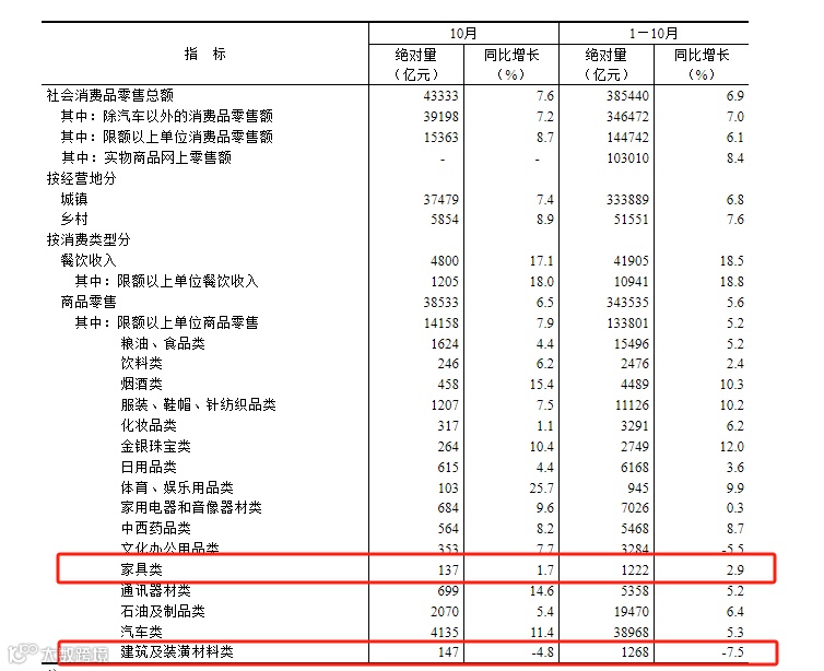 发布了2023年10月社会消费品零售总额数据。1-10月家具类零售总额同比增长2.9%,慢于社会消费品零售总额6.9%的增速。