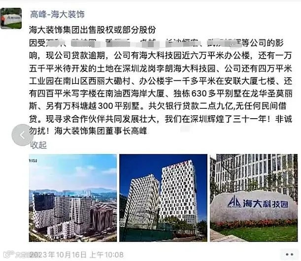 无独有偶,上个底深圳知名装企海大装饰集团的董事长高峰一张“深圳海大装饰集团董事长发朋友圈出售股份救急”的图片广为传播。截图内容中称,因受房企影响,现公司