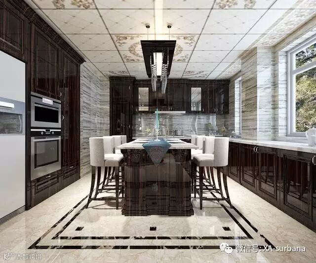 嵌入式的吊顶搭配中式的灯,塑造出一个怀旧的氛围,搭配斜铺的瓷砖,简谱的家具,彰显出业主的品味。