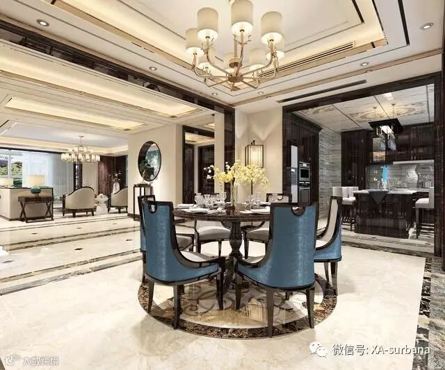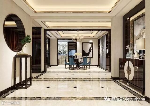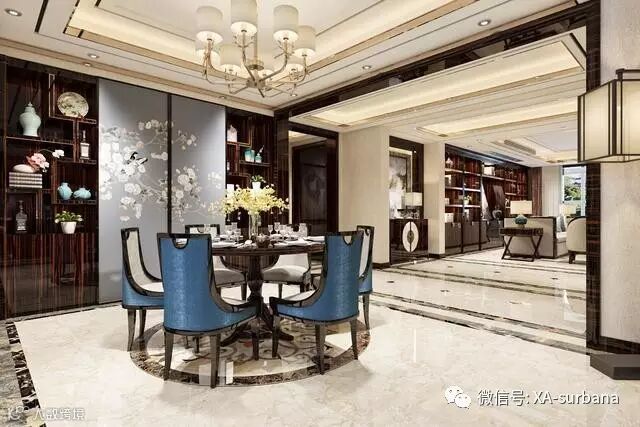 走廊的作用就是起到区域划分,让空间更立体,完美的吊顶搭配地面瓷砖的拼花,彰显出主人的品味。餐厅采用新中式的餐桌餐椅,搭配壁画,稳重而又清新,别具一格。