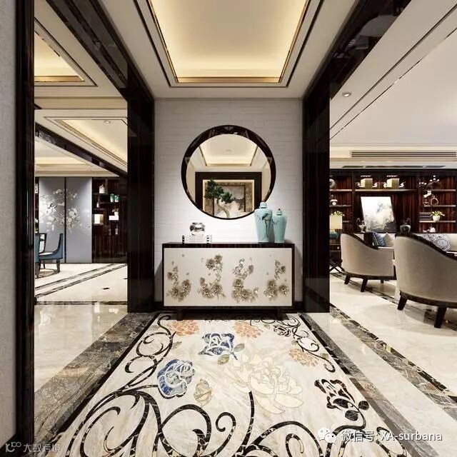 入户门的瓷砖采用拼花工艺,和吊顶玄关柜都是相对应的,整体看上去十分彰显品质。