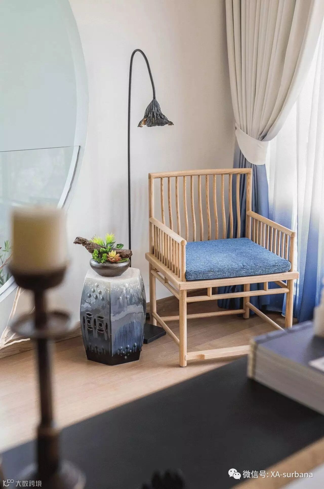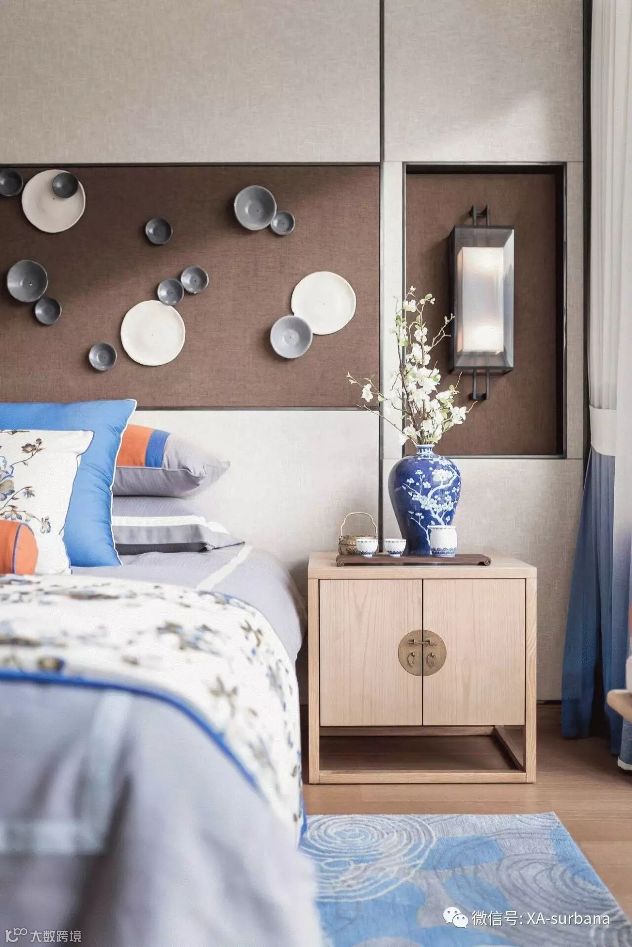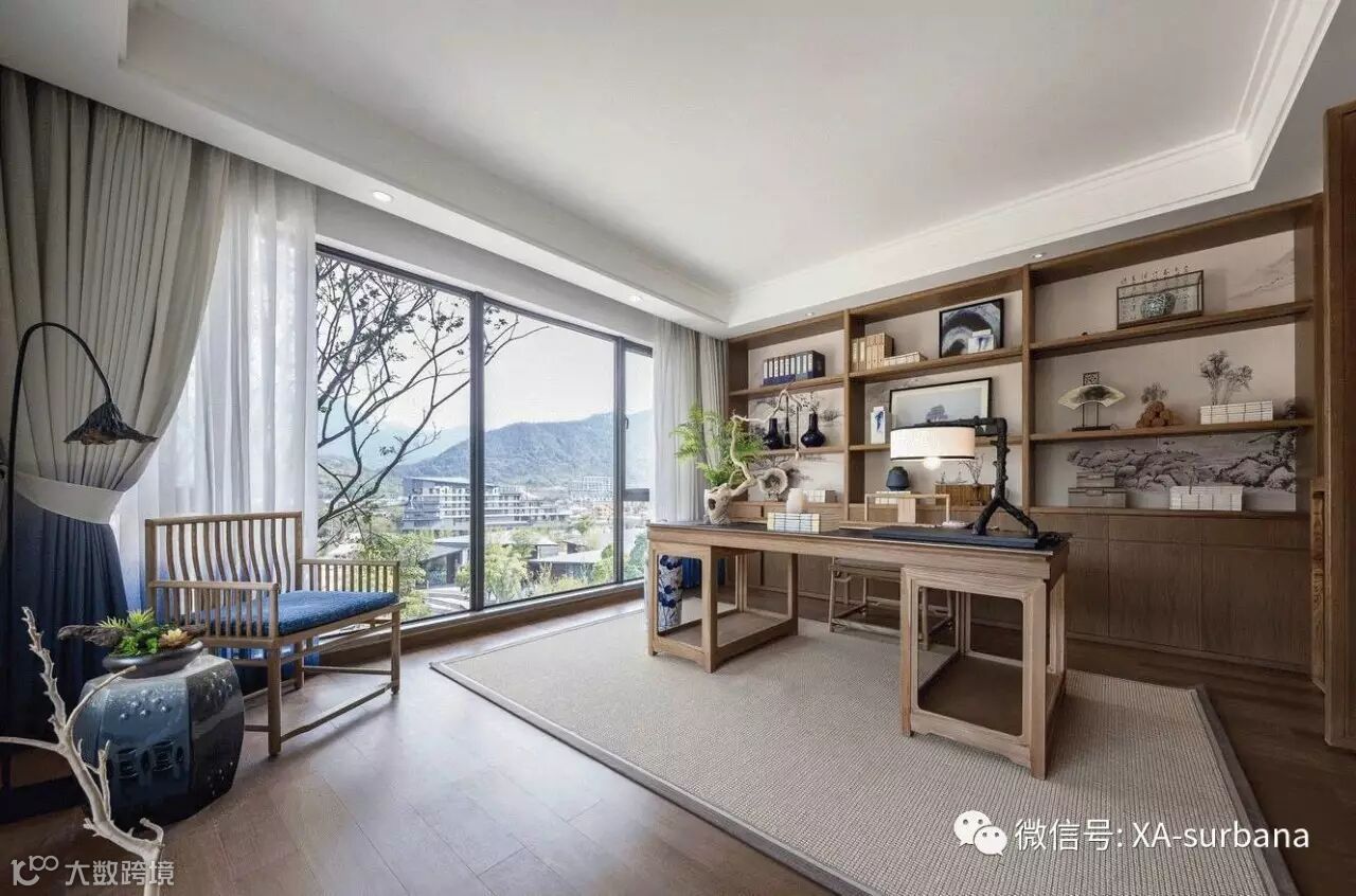 家具形态更显简约与流畅,空间配色以古色古香的原木色主导整个空间,生机勃勃的的绿植与蓝色装饰作为点缀,营造安静、舒适的空间感受。