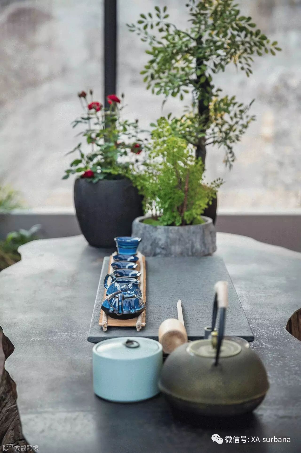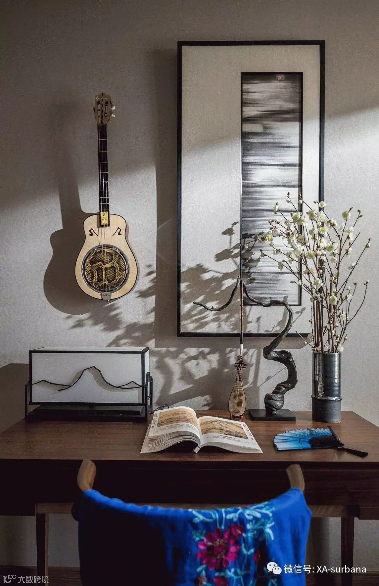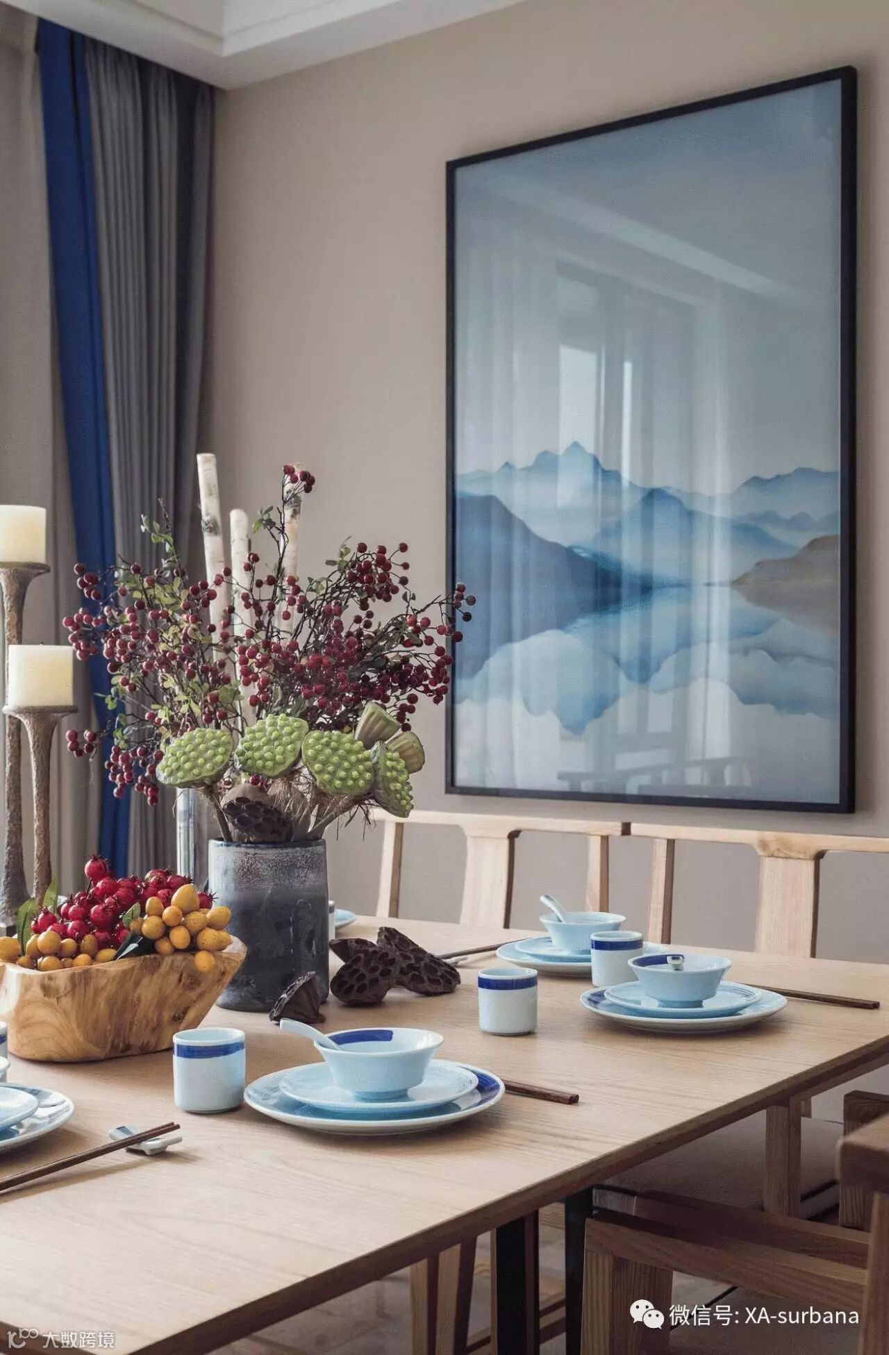 家具形态更显简约与流畅,空间配色以古色古香的原木色主导整个空间,生机勃勃的的绿植与蓝色装饰作为点缀,营造安静、舒适的空间感受。
