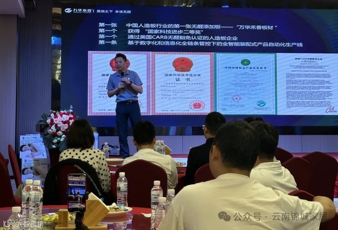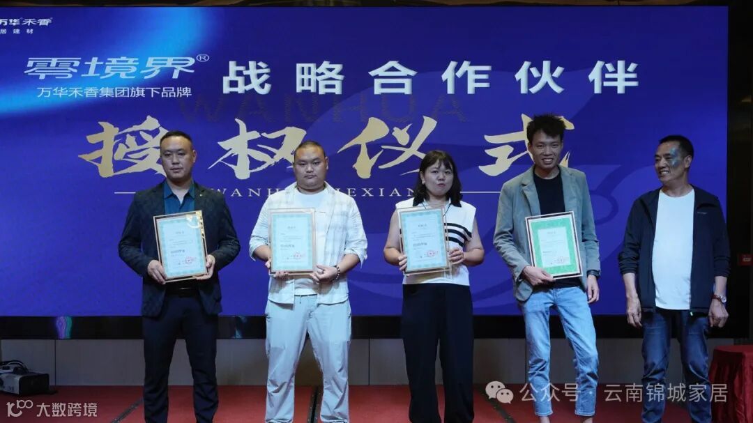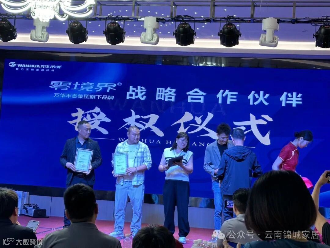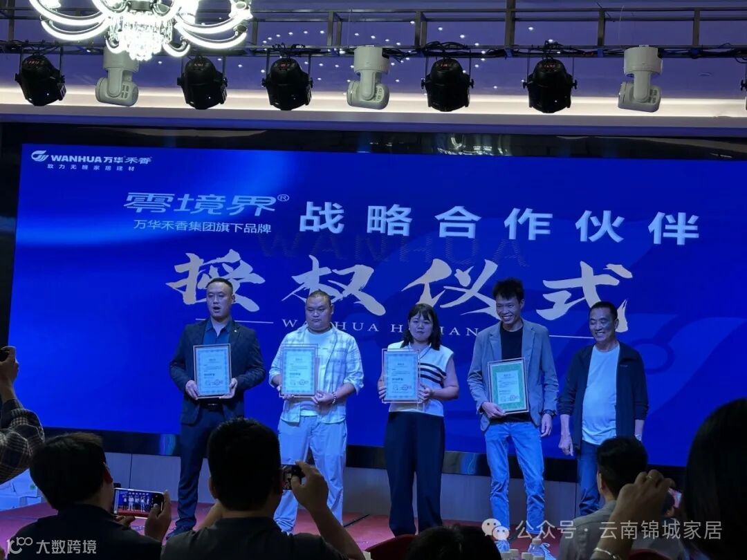 在活动的荣誉颁发环节,远盛福临公司的领导为万华禾香零境界板的授权客户逐一颁发了荣誉牌匾,并与他们合影留念。云南锦城格林公司,作为战略合作伙伴,其代表在台上接受了远盛福临公司领导颁发的授权证书,这一荣耀时刻凸显了其在合作中的重要角色。