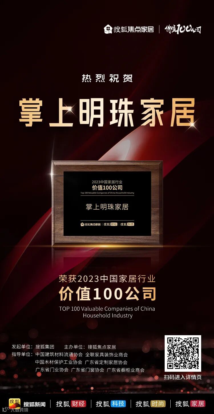 聚势焕新,韧性成长!聚焦中国家居产业!2024年1月16日,由搜狐焦点家居联合搜狐财经、搜狐科技、搜狐时尚等主流频道主办的“2023中国家居行业价值100公司”榜单正式公布。掌上明珠作为家居行业的优秀代表,经线上投票和专家评审,凭借强大的创新力、产品力、品牌力、