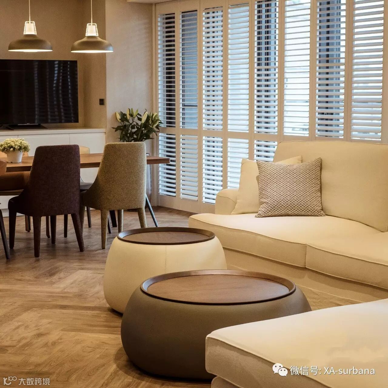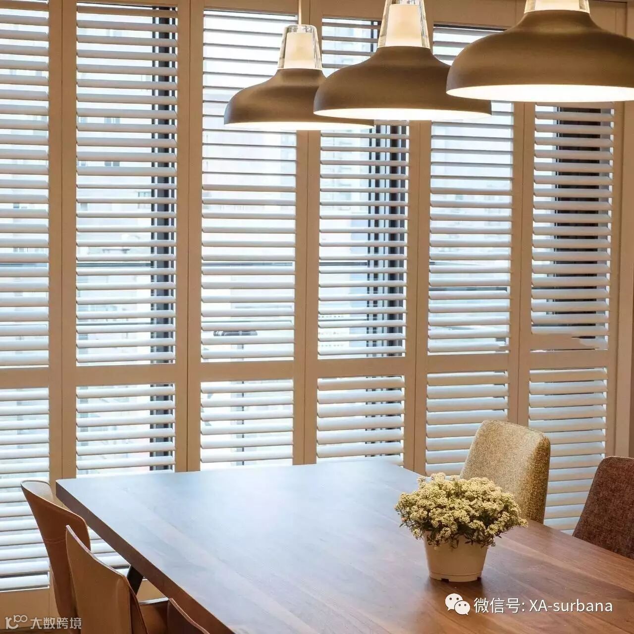 考虑到隐私问题,利用可收折白色木百叶窗帘遮挡,光线依旧得以穿透又能避免被窥探,相较布质窗帘则更好清洁!