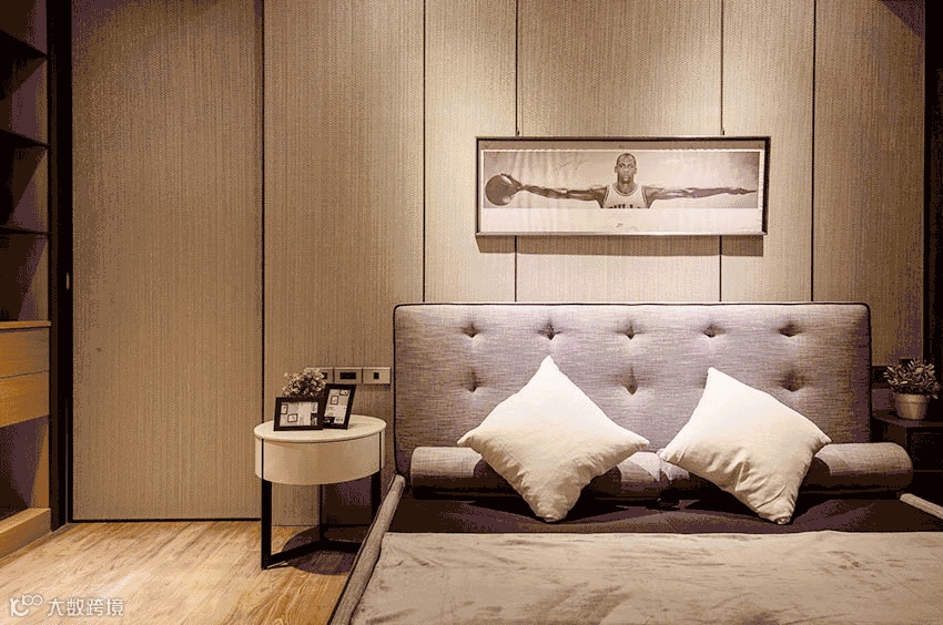 主要衣物与私人用品都被完整收纳在更衣室中,睡眠区则运用开放层架陈列心爱收藏,好比说床头的乔登的照片,而透过黑框拉门则能进入主卧卫浴,安装双洗手台,让忙碌的黑人与范范拥有独立梳洗区域不互相干扰。