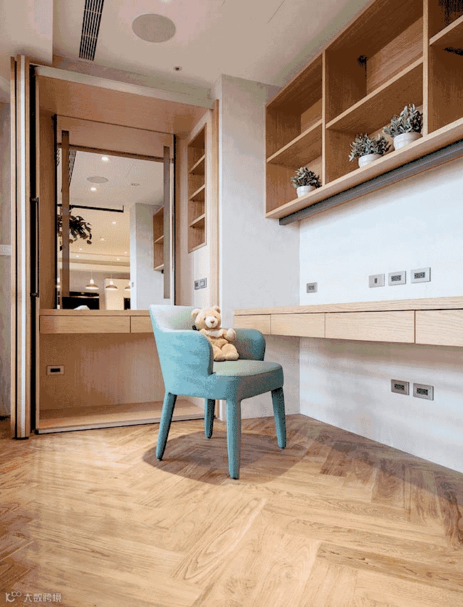 隐身于靠近书房的摺叠门之后,里头层柜设计能整齐摆放化妆、保养用品,日常生活时只要将门阖上,即可成为阳光充足的工作书房。
