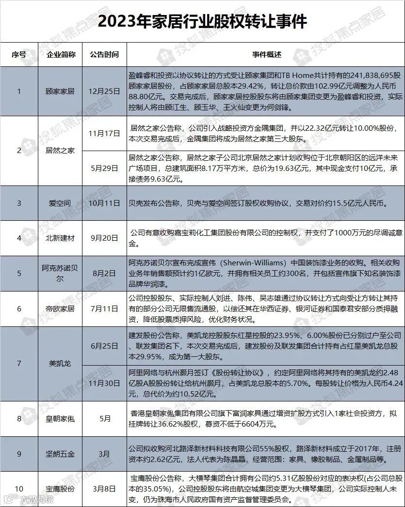 于此,搜狐焦点家居特别策划2023年度系列盘点。本篇将从股权转让的角度出发进行梳理和简要分析。或变更控股股东、或国资入局,搜狐焦点家居根据公开资料,聚焦中国家居市场,遴选出十起相对典型的大额股权转让事件,其中涉及到红星美凯龙、居然之家、顾家家居、宣伟、帝欧家居、爱空间、坚朗五金、皇朝家俬、北新建材、宝鹰股份等细分领域的代表企业。