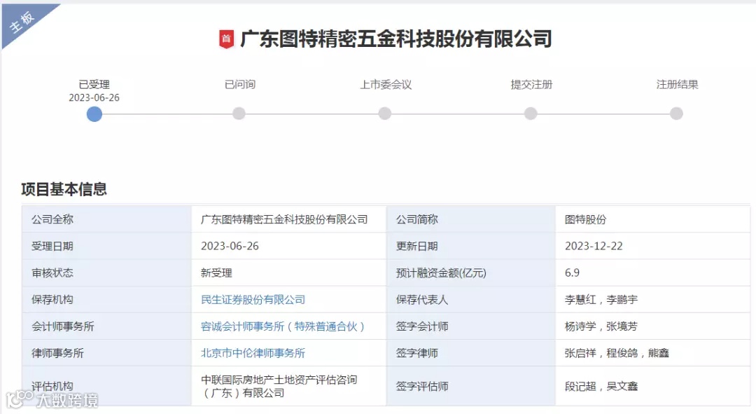 12月24日消息,深圳证券交易所官网显示广东图特精密五金科技股份有限公司在12月22日恢复了上市审核进程。