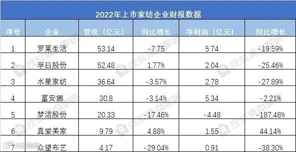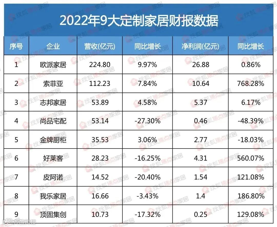 近日,搜狐焦点家居根据公开素材统计,多家家居企业公告2023年一季度业绩。2023年一季度,东鹏控股营收约11.44亿元,同比增长18.46%;净利润约117.77万元,同比增长101.53%;东易日盛营业总收入5.54亿元,同比增长47.89%,净利润同比增长62.94%;好莱客营业收入3.48亿,同比减少43.47%,净利润1200.78万,同比减少70.66%;皮阿诺营收1.79亿元,同比下降24.20%,净利润为-386.30万元,同比下降120.70%;顶固集创营收约2.24亿元,同比上升22.19%,净利润473.36万元,同比上升22.32%;水星家纺营收约8.18亿元,同比增长1.45%,净利润约8365.95万元,同比下降1.22%。