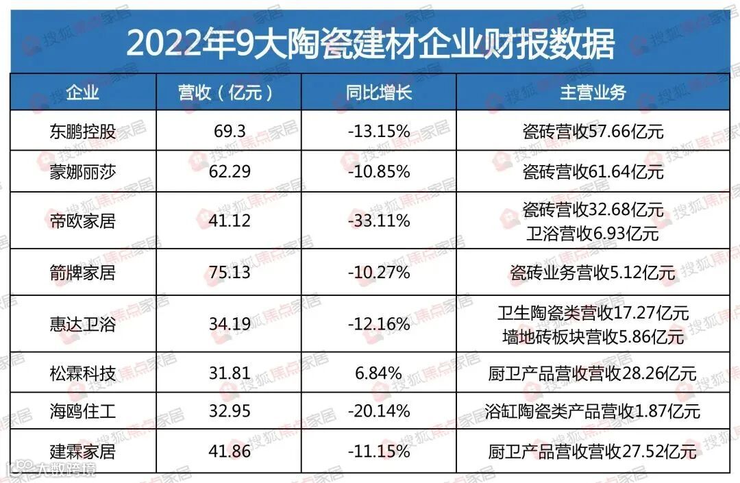 东鹏控股营业收入11.44亿元,同比增长18.46%,净利润117.77万元,同比增长101.53%;蒙娜丽莎实现营业收入11.01亿元,同比增长3.55%,净利690.06万元,同比增长109.35%;帝欧家居营收约6.1亿元,同比减少20.32%,净利润亏损约8032万元;箭牌家居营收11.1亿元,同比下降1.67%,归母净利润311万元,同比下降88.15%。