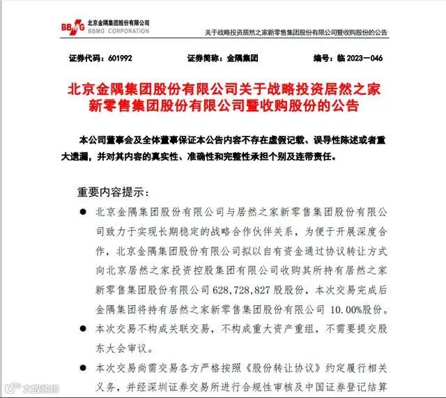 最近,金隅集团公告披露,公司与北京居然之家投资控股集团有限公司及其一致行动人汪林朋、霍尔果斯慧鑫达建材有限公司签署了《股份转让协议》,公司拟以自有资金受让居然控股持有的深圳证券交易所上市公司即居然之家新零售集团股份有限公司(以下简称“居然之家”)约6.29亿股股份,转让价格为每股人民币 3.55 元,交易总金额为约人民币22.32亿元。本次交易完成后,公司将直接持有居然之家 10.00%股份。
