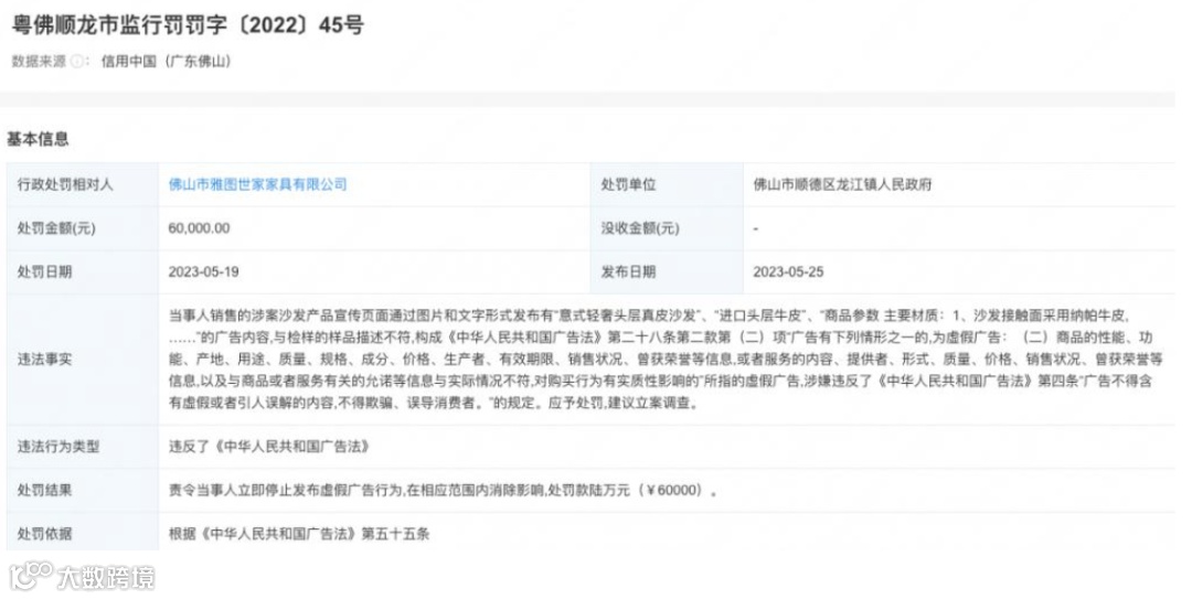 据处罚文书,该公司销售的涉案沙发产品宣传页面通过图片和文字形式发布有 " 意式轻奢头层真皮沙发 " 等广告内容,与检样的样品描述不符,涉嫌违反了《中华人民共和国广告法》,根据相关规定,佛山市顺德区龙江镇人民政府责令雅图世家立即停止发布虚假广告行为,并罚款 6 万元。