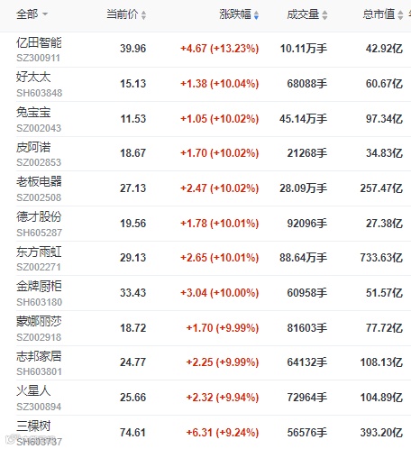 个股方面,亿田智能涨超13%,好太太、兔宝宝、皮阿诺、老板电器、德才股份、东方雨虹、金牌厨柜、蒙娜丽莎、志邦家居等超10家企业实现涨停,火星人、三棵树、箭牌家居、顾家家居等均涨超9%。