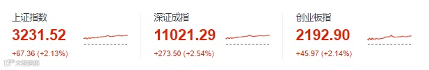 截至今天下午收盘,A股三大股指大涨,上证指数涨2.13%、深证成指涨2.54%、创业板指涨2.14%。