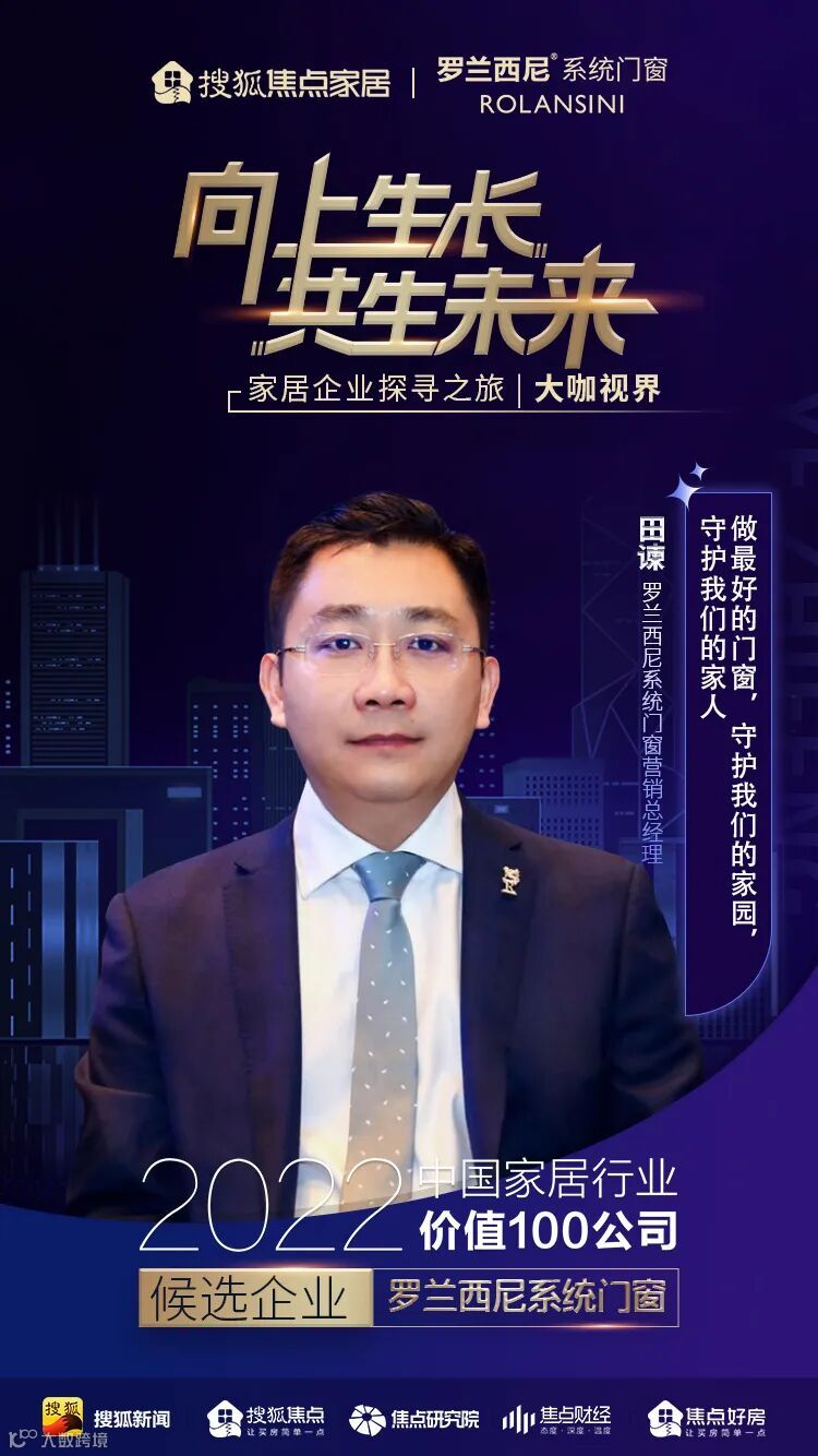 近日,由搜狐集团发起,搜狐焦点家居联合焦点研究院主办,“向上生长 共生未来——2022中国家居行业价值100公司”评选热烈进行中,为了深度挖掘企业硬核价值,探寻企业向上生命力,搜狐焦点家居年度特别策划《大咖视界》,本期对话罗兰西尼系统门窗营销总经理——田谏,解读家居热点,共话家居趋势,助推行业高质量发展。