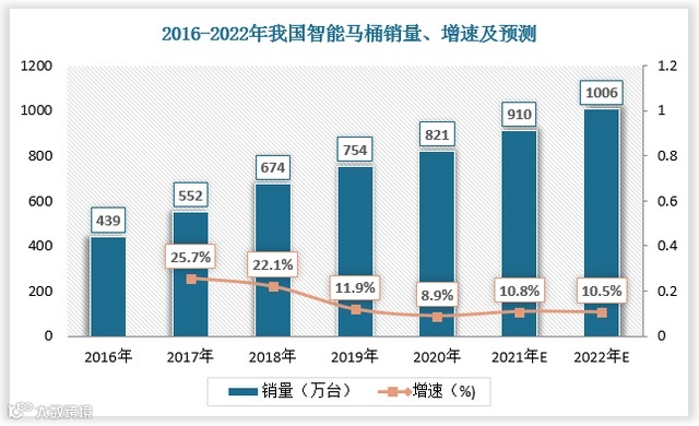 虽然我国的马桶渗透率在全球相比较低,但是在国内市场销量呈持续上升的趋势。据观研报告网发布的《中国智能卫浴行业现状深度研究与未来投资调研报告(2022-2029年)》显示,我国智能马桶销量从2016年的439万台上升至2021年的910万台左右。预计2022年我国智能马桶销量将超1000万台。