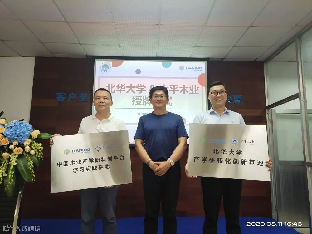 北华大学是吉林省省属综合性重点大学,省级博士立项建设单位。会上时君友教授向大家介绍了北华大学的情况,希望以本次北华大学与大平公司产学研转化创新基地的成立为契机,今后双方开展有效、务实的校企合作,共同发展进步。接着时君友教授向大平公司授予“中国木业产学研科创平台学习实践基地”和“北华大学产学研转化创新基地”牌,何伟锋总裁和肖树彬总经理接牌。