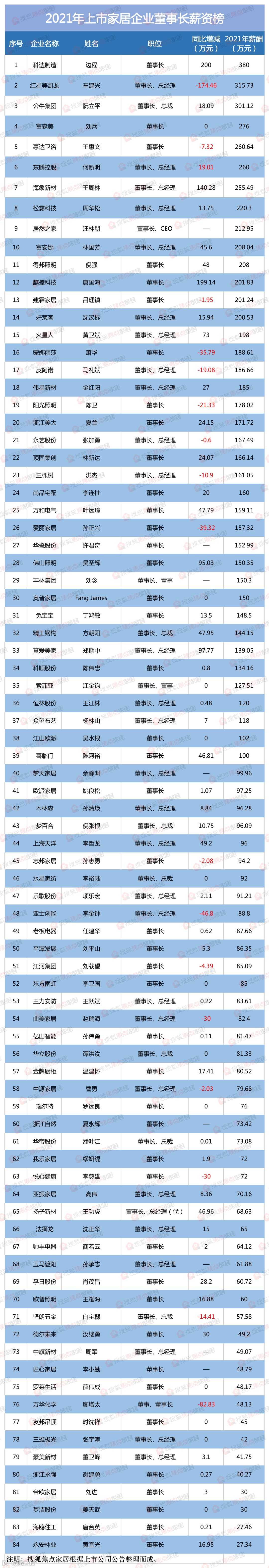 根据榜单显示,3家企业董事长的在2021年的薪酬过300万,除了位于榜首的科达制造边程董事长以外,红星美凯龙车建兴董事长兼总经理,在2021年降薪约174万,但总额为315.73万元,位于榜单的第二名;公牛集团的阮立平董事长兼总裁,在2021年加薪18万,以301.12万元位居第三。