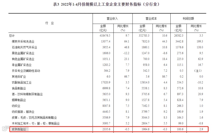 5月27日,国家统计局发布2022年1—4月份全国规模以上工业企业利润数据的公告。其中,1-4月份,全国家具制造业营业收入2335.6亿元,同比下降0.5%;营业成本1964.6亿元,同比下降0.3%;利润总额100.6亿元,同比增长2.9%。