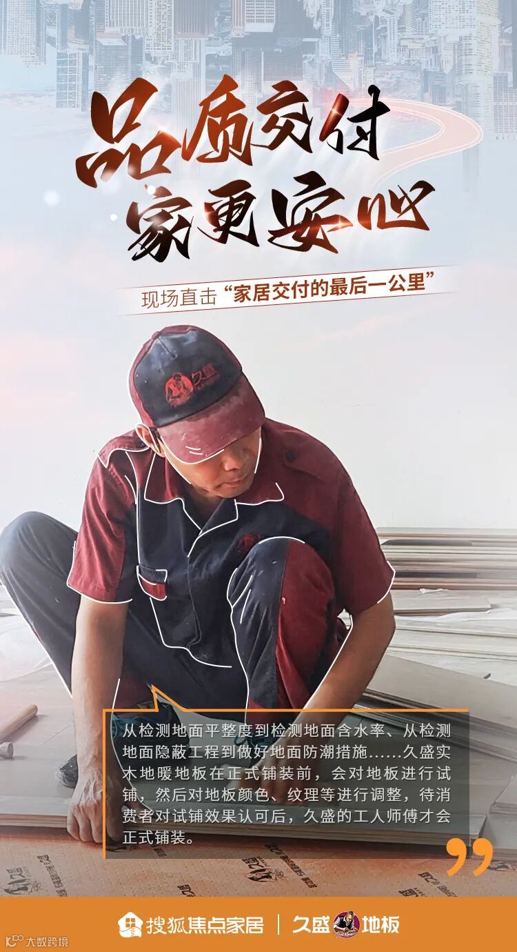 从检测地面平整度到检测地面含水率、从检测地面隐蔽工程到做好地面防潮措施、从试铺满意到正式铺装……据悉,久盛实木地暖地板在正式铺装前,会对地板进行试铺,然后对地板颜色、纹理等进行调整,待消费者对试铺效果认可后,久盛的工人师傅才会正式铺装。
