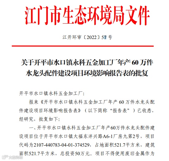 据江门市生态环境局网站信息,4月15日,江门市生态环境局开平分局发布《关于开平市水口镇永科五金加工厂年产60万件水龙头配件建设项目环境影响评价文件审批的公告》。据批复文件,该项目位于开平市水口镇大福东泮兴路A6-1厂房九第2号,项目代码为2107-440783-04-01-374529,占地面积521.7平方米,建筑面积521.7平方米,总投资50万元。