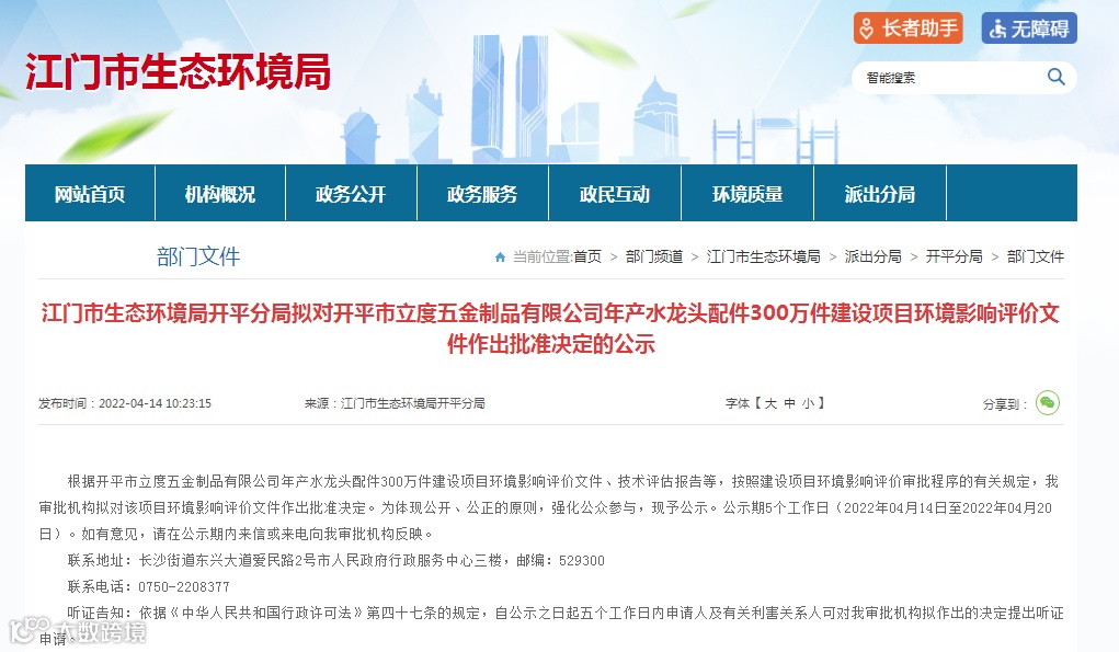 据开平市生态环境局网站信息,4月14日,江门市生态环境局开平分局发出《拟对开平市立度五金制品有限公司年产水龙头配件300万件建设项目环境影响评价文件作出批准决定的公示》。据公示信息,该项目位于广东江门开平市水口镇金山东大道58号4座603、604车间,占地1988.03平方米,总投资300万元,其中环保投资45万元,目前项目已经建成。