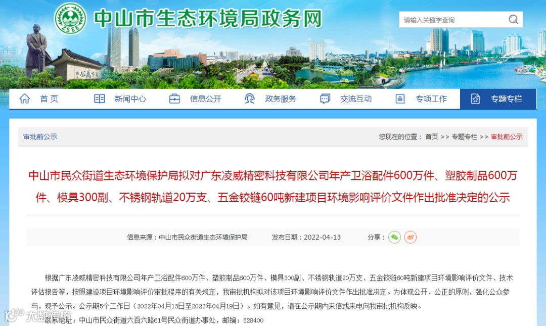 据中山市生态环境局网站信息,中山市民众街道生态环境保护局近日对广东凌威精密科技有限公司一项目的环境影响评价文件作出批准决定。该项目位于中山市民众镇三墩行政村三益路179号之三一楼二楼A区,用地面积为9987.9平方米,建筑面积为12750平方米,可年产卫浴配件600万件、塑胶制品600万件、模具300副(自用)、不锈钢轨道20万支、五金铰链60吨。