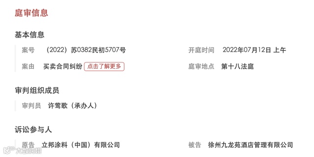 该案的公诉人/原告/上诉人/申请人为立邦涂料,被告人/被告/被上诉人/被申请人为徐州九龙苑酒店管理有限公司(以下简称“九龙苑酒店”),开庭