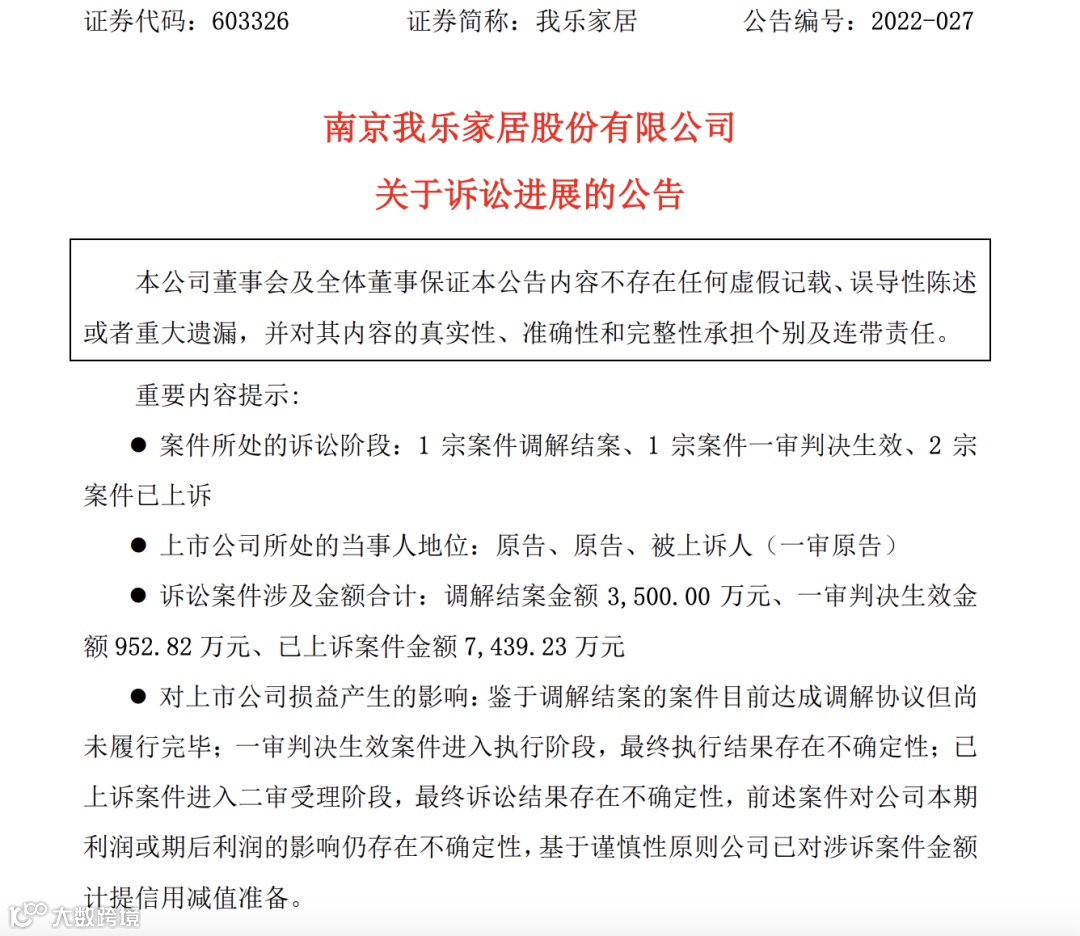7月12日我乐家居发布公告,截至公告日新增诉讼事项涉及金额9114.44万元(不含利息、违约金及实现债权费用等),占公司最近一期经审计净资产的10.43%。