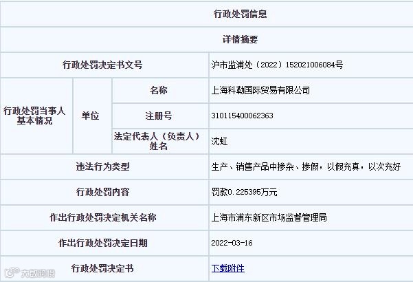上海市市场监督管理局网站日前公布的行政处罚决定书(沪市监浦处〔2022〕152021006084号)显示,上海科勒国际贸易有限公司存在生产、销售产品中掺杂、掺假,以假充真,以次充好的违法行为,上海市浦东新区市场监督管理局对其罚款0.225395万元,处罚日期2022年3月16日。