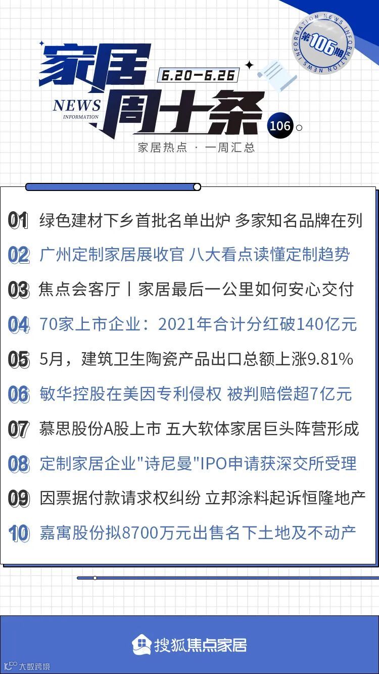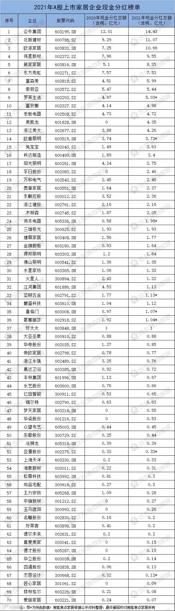 截至2022年6月22日,搜狐焦点家居根据公开资料,整理了70家A股上市家居企业年报披露的现金分红计划,总体而言,合计超140亿元,过半企业现金分红总额过亿;2021年每股股利普遍上涨,火星人、东鹏控股等下降;受疫情、原材料上涨等影响,近20家上市家居企业取消分红。