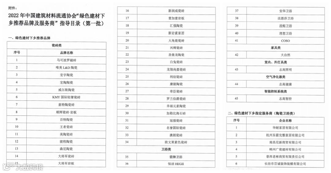 其中有34家瓷砖品牌(马可波罗磁砖、唯美L&D陶瓷等),7家卫浴品牌(箭牌卫浴、恒洁HEGII等),1家家具品牌(大自然),1家灯具品牌(志高照明),1家空气净化器品牌(志高健康)和1家智能控制系统品牌(志高智控);此外,指定服务商(陶瓷卫浴类)27家、试点专业卖场(陶瓷卫浴类)4家、指定流通服务企业(综合类家居建材卖场)5家、绿色家装推广单位4家。