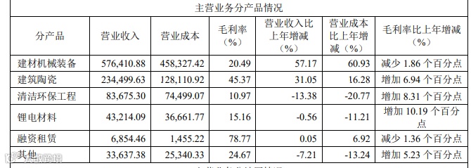 公开资料显示,科达制造股份有限公司,主要从事建材机械和海外建筑陶瓷的生产和销售,主要产品有建材机械装备、清洁环保设备、融资租赁、锂电材料、建筑陶瓷。2021年公司实现营业收入97.97亿元,同比增长34.24%,其中,建筑陶瓷营业收入达23.45亿元,同比增长31.05%。