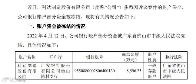 搜狐焦点家居获悉,2022年4月12日,科达制造银行账户8596.25万元的资金被广东省佛山市中级人民法院冻结,占公司最近一期经审计的货币资金的4.38%。