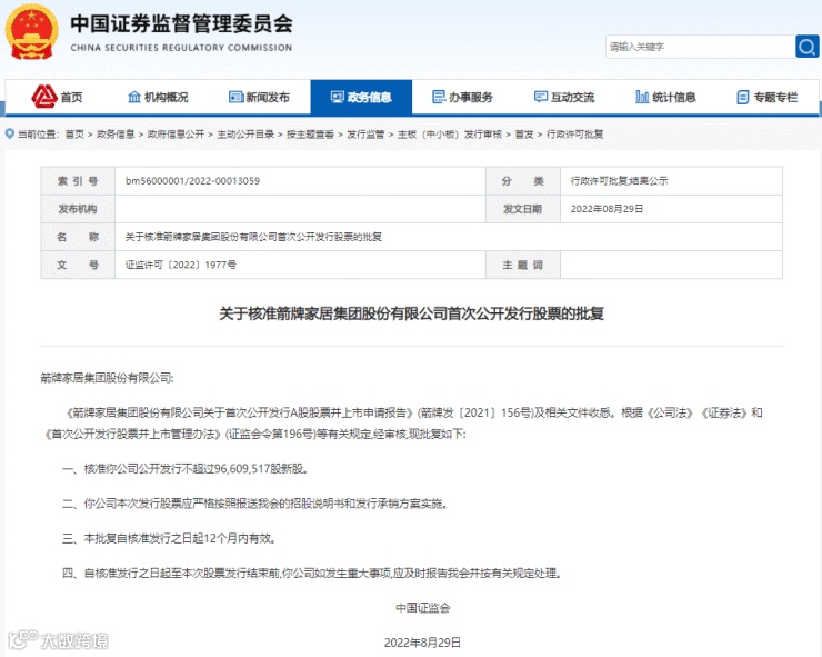 2022年9月1日,中国证监会发布关于核准箭牌家居集团股份有限公司(以下简称“箭牌家居”)首次公开发行股票的批复,核准箭牌家居公开发行不超过96,609,517股新股。本次IPO箭牌家居计划融资18.09亿元。