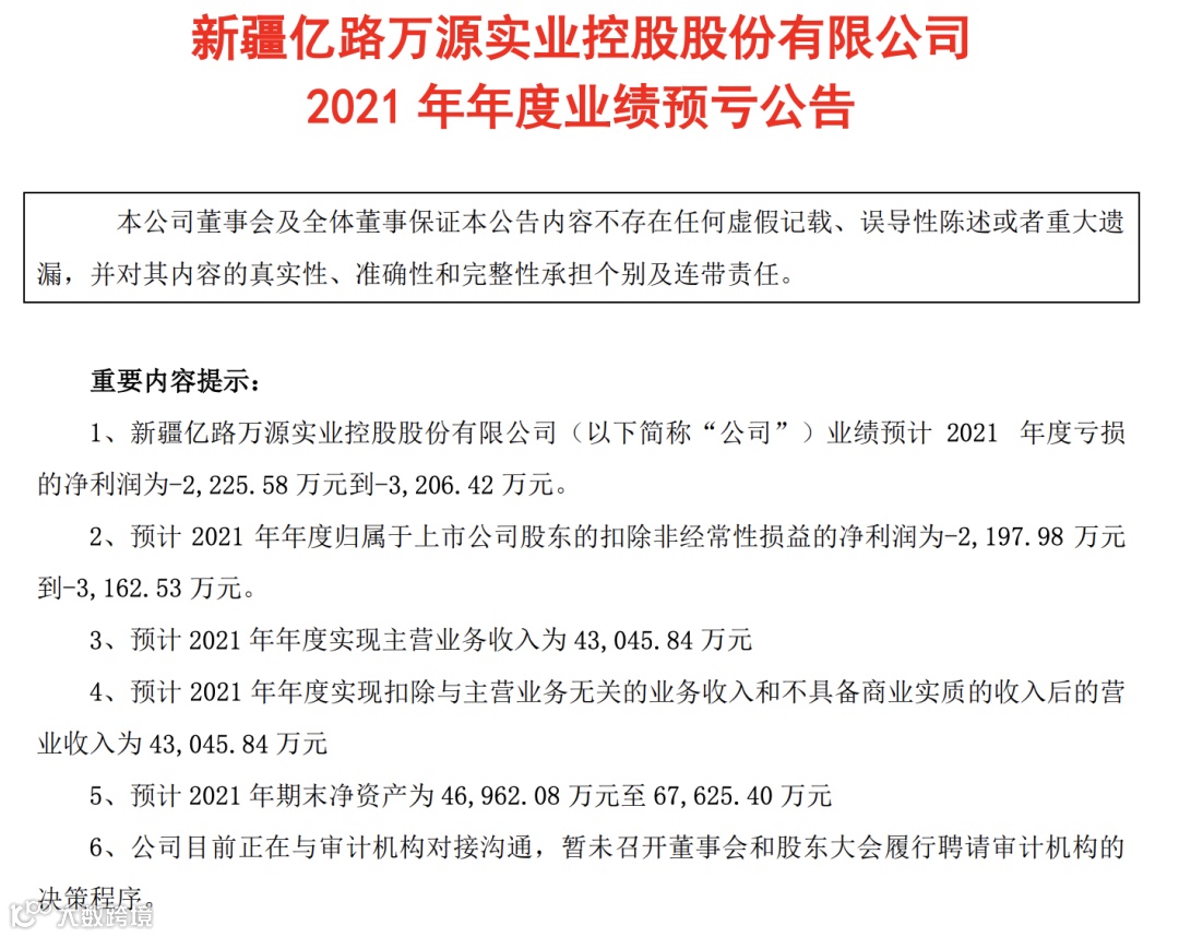 根据新亿实业今年1月27日发布的业绩预亏公告,*ST新亿预计2021年实现营收约为4.3亿元,其归母净利润亏损-2225.58 万元到-3206.42 万元。