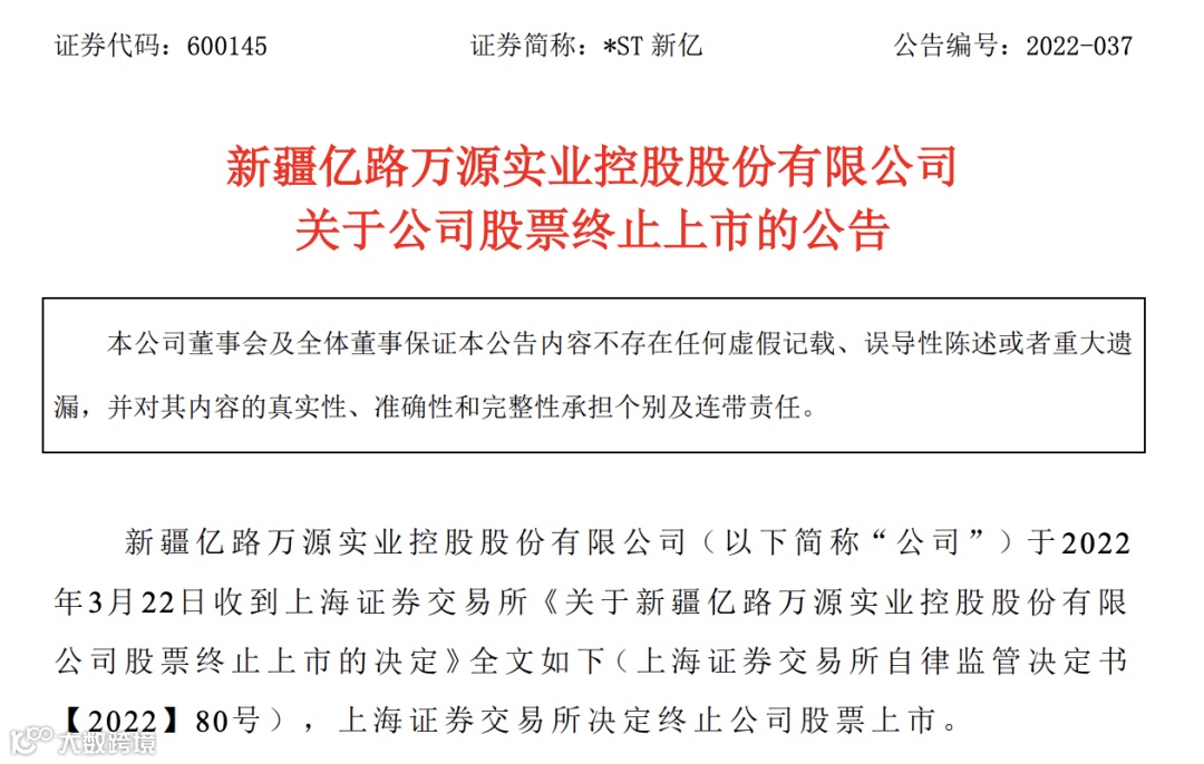 3月22日,新疆亿路万源实业控股股份有限公司(简称“*ST新亿”或“新亿实业”)发布股票终止上市公告表示,公司于当日收到上交所终止公司股票上市的决定,因财务造假行为,公司被上交所实施重大违法强制退市。