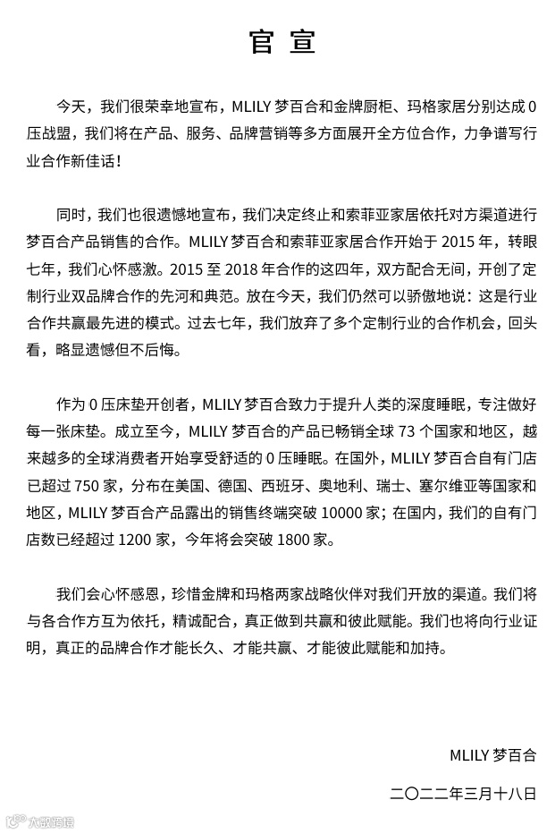 2022年3月18日,MLILY梦百合发布公告,官宣和金牌厨柜、玛格家居分别达成0压战盟,将在产品、服务、品牌营销等多方面展开全方位合作;同时,遗憾宣布终止和索菲亚家居依托对方渠道进行梦百合产品销售的合作。