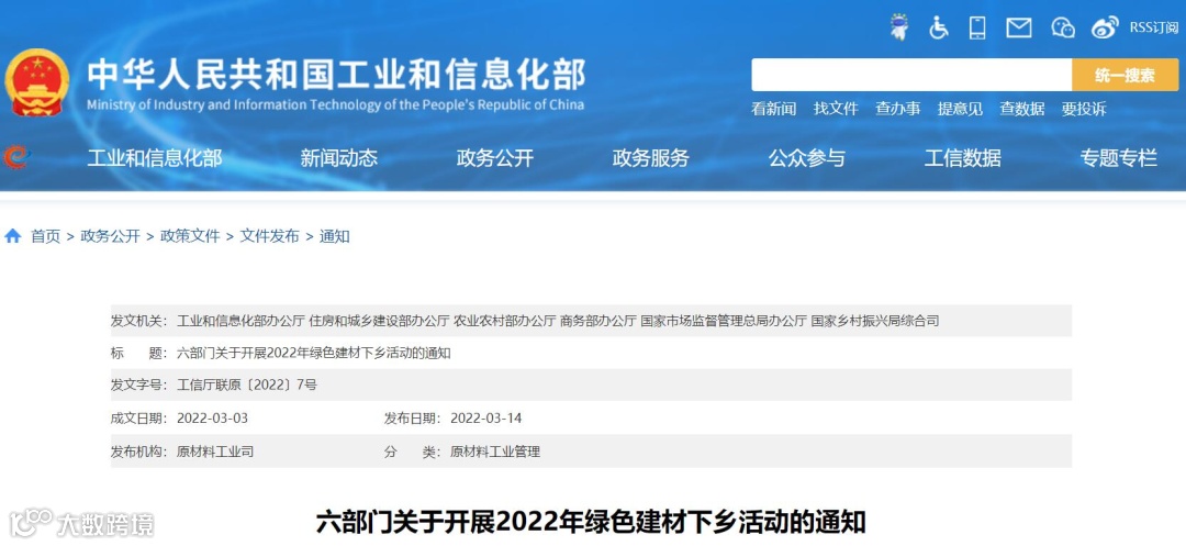 近日,工业和信息化部办公厅、住房和城乡建设部办公厅、农业农村部办公厅、商务部办公厅、国家市场监督管理总局办公厅及国家乡村振兴局综合司,共六部门联合印发有关“六部门关于开展2022年绿色建材下乡活动”的通知。通知表示,鼓励有条件的地区对绿色建材消费予以适当补贴或贷款贴息;鼓励企业、电商、卖场等让利于民,助推绿色消费。