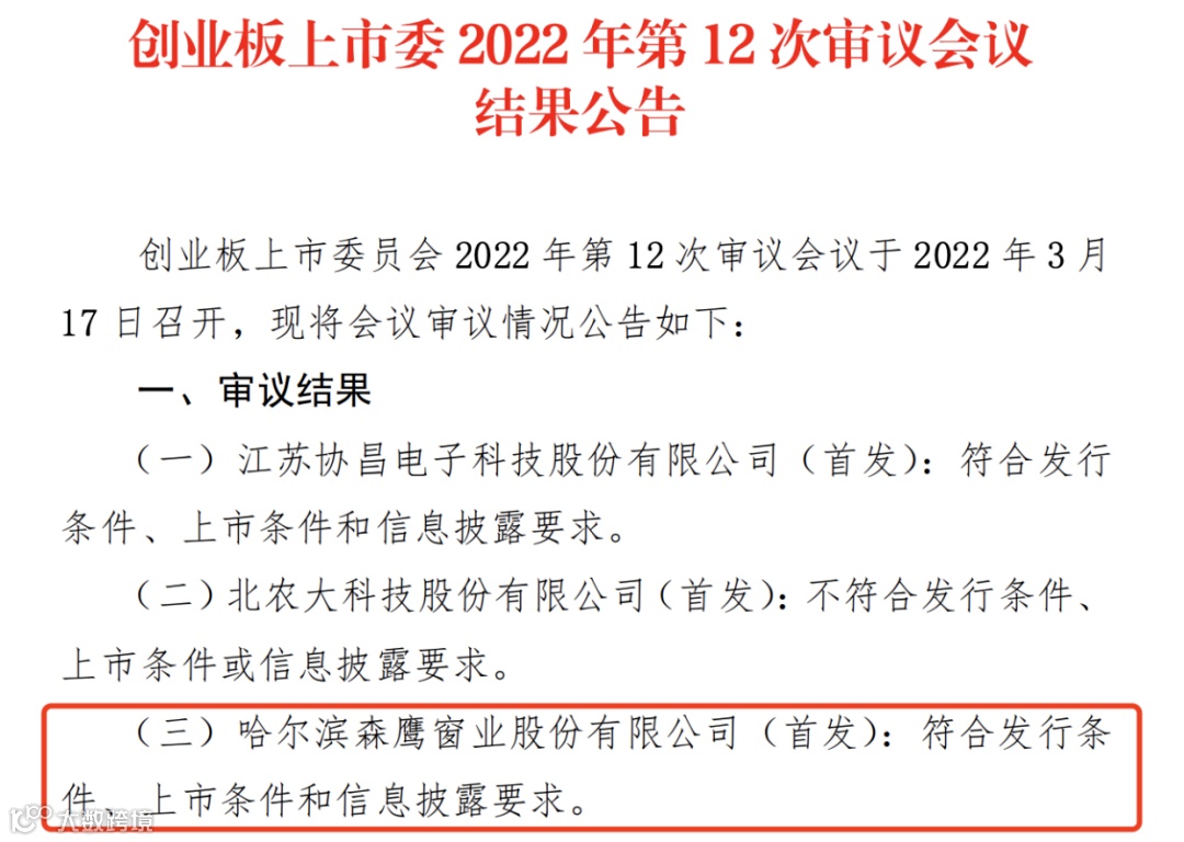 3月17日,哈尔滨森鹰窗业股份有限公司(以下简称“森鹰窗业”或公司)深圳创业板IPO首发过会,本次上市保荐机构为民生证券,公司计划发行不超过过2,370万股,占发行完成后公司总股本的比例不低于25%;公司拟公开募集资金约6.73亿元,主要用于哈尔滨年产15万平方米定制节能木窗建设项目、南京年产25万平方米定制节能木窗项目以及补充流动资金。