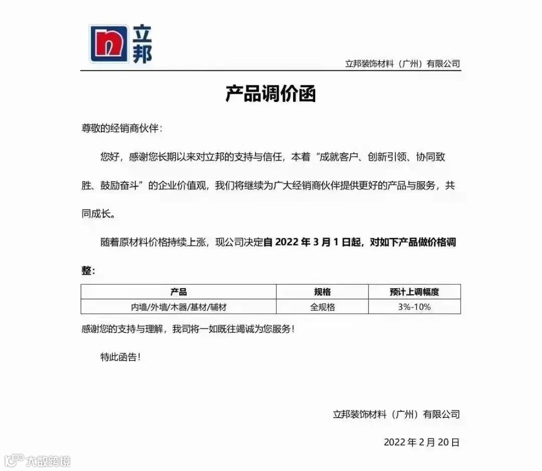 作为国内最大的装饰涂料零售企业,立邦中国旗下全资子公司立邦装饰材料(广州)有限公司于2月20日发布产品调价函称,随着原材料价格持续上涨,现公司决定自2022年3月1日起,上调内墙涂料、外墙涂料、木器涂料、基材、辅材产品价格,预计上调幅度为3%-10%。