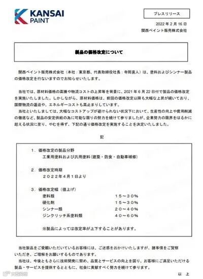 2022年2月16日,关西涂料股份有限公司发布《关于涂料及稀释剂产品的价格调整》的通知。价格调整的产品领域包括工业涂料和通用涂料(建筑、防腐、汽车维修),价格修改时期自2022年4月1日起。